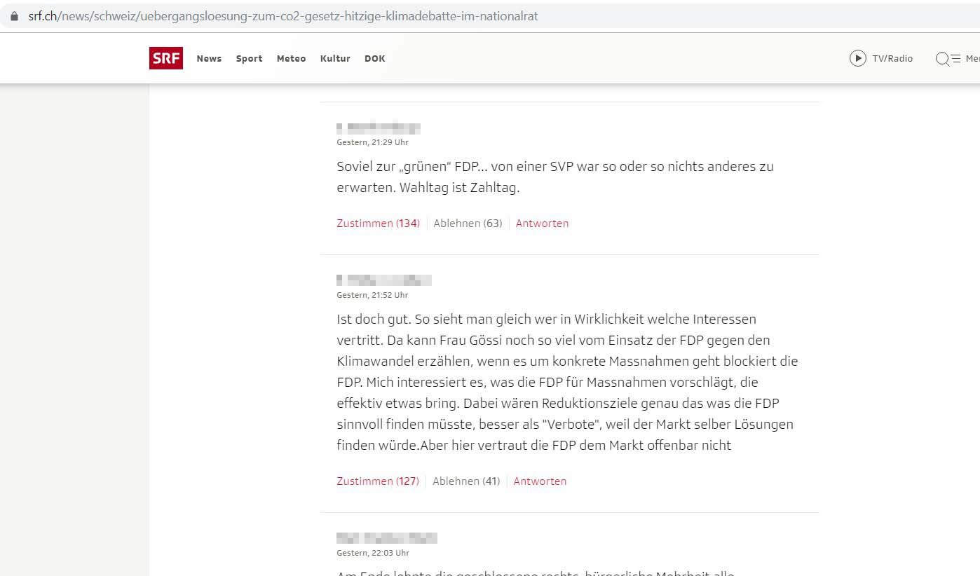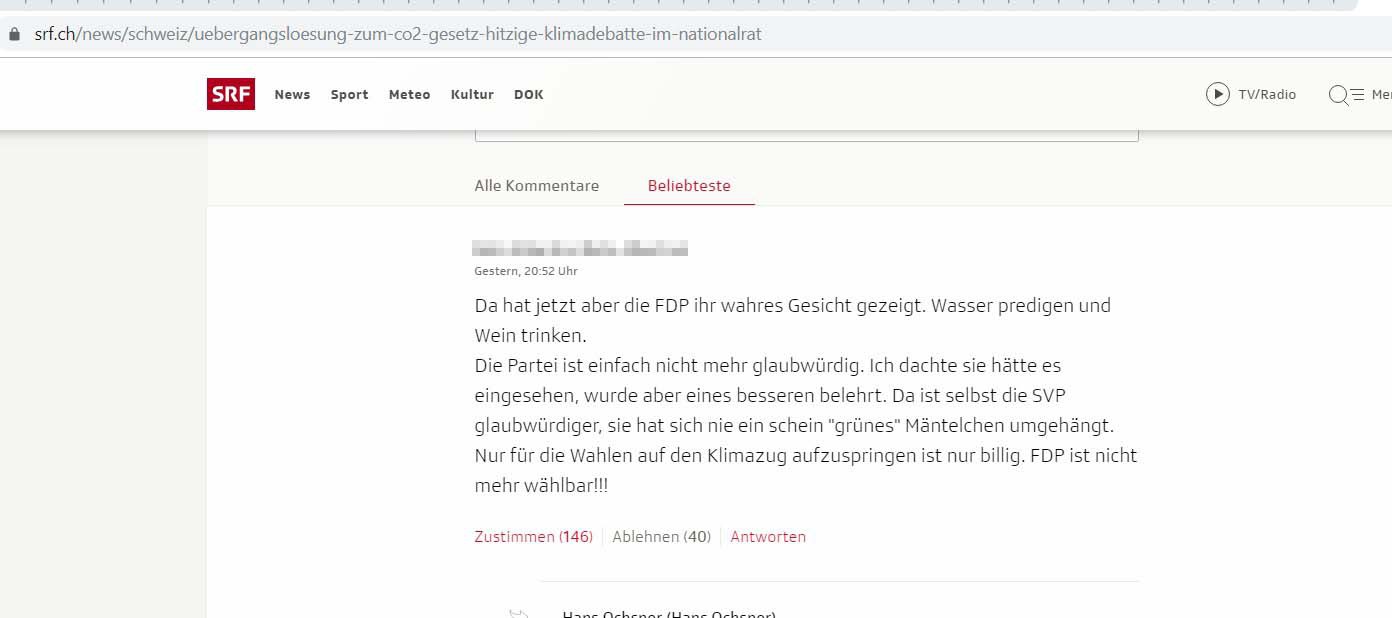 Auf die massiven Anschuldigungen, welche SRF natürlich prominent erwähnte, konnte sich weder die SVP noch ein FDP-Vertreter wehren. Im Gegensatz zum Beitrag der Tagesschau welche hier mal einigermassen ausgewogen berichtete. Die FDP erteilte diesen Anträgen nicht mal primär eine Absage. Wollte diese Debatte nur beim neuen CO2-Gesetz führen.