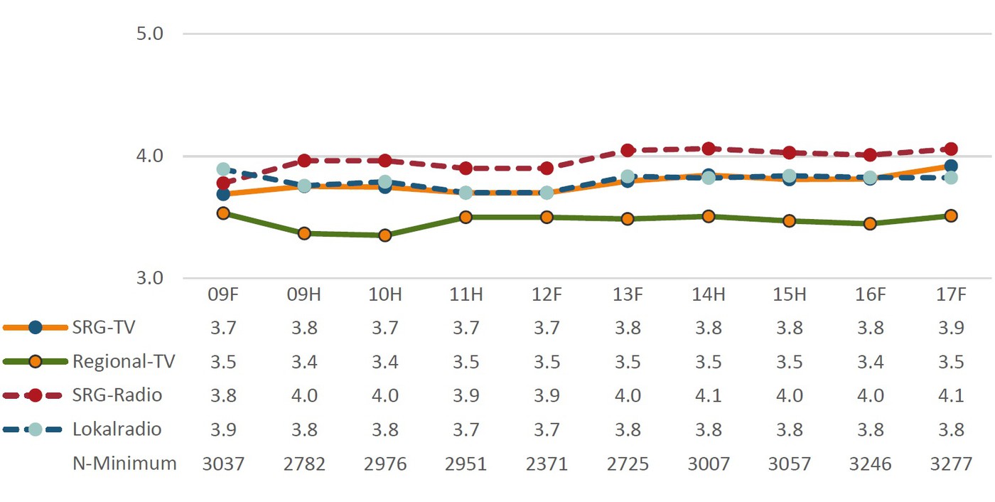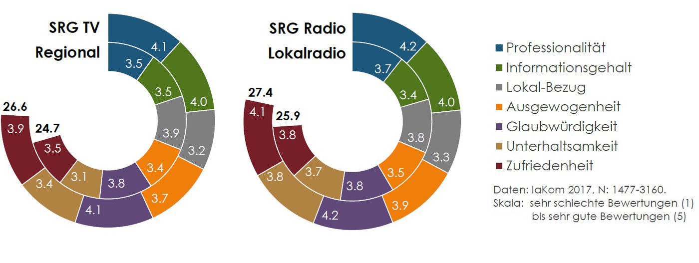 Wie in den Vorjahren werden die Angebote der SRG-Radiosender mit leichtem Vorsprung am besten bewertet (3.9 im Durchschnitt auf einer Skala von 1 «sehr schlecht» bis 5 «sehr gut»), schreibt das Forschungsunternehmen Iakom, welches die Studie im Auftrag des Bakom durchgeführt hat. Die Nutzer würden die Qualität der Regional-TV-Sender, der SRG-TV-Sender und der SRG-Radiosender nochmals besser bewerten als in den letzten Jahren. In diesem Jahr wurde das Angebot der SRG-Fernsehsender (3.8) erstmals insgesamt besser bewertet als die lokalen Radiosender (3.7).