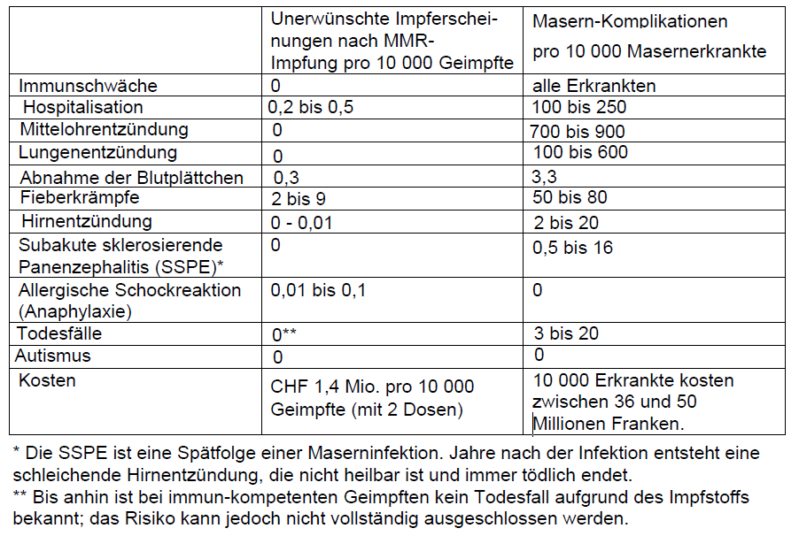 In der Stellungnahme der Redaktion Rundschau werden die grundsätzlichen Themen rund um die Masernimpfungen ausführlich dargelegt. SRF stützt sich dabei auf Zahlenmaterial des Bundesamtes für Gesundheit BAG und der Weltgesundheitsorganisation WHO. Nach aktuellem Stand der Wissenschaft sind die Folgeerscheinungen des Impfens weit weniger gravierend als die Folgeerkrankungen einer Masernerkrankung.