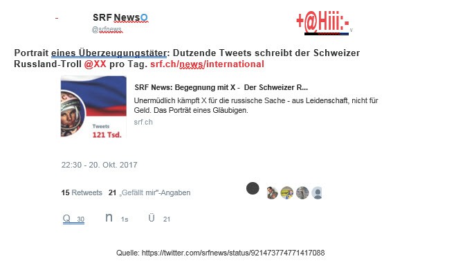 Woher nimmt sich die Social Media Redaktion des SRF das Recht heraus, eigenmächtig einen völlig anderen Sachverhalt in einen Tweet hineinzuinterpretieren, eine Frage des Autors in eine Tatsachenbehauptung und die Bezeichnung ‹Internet-Troll›, in ‹Russland-Troll› umzuwandeln?