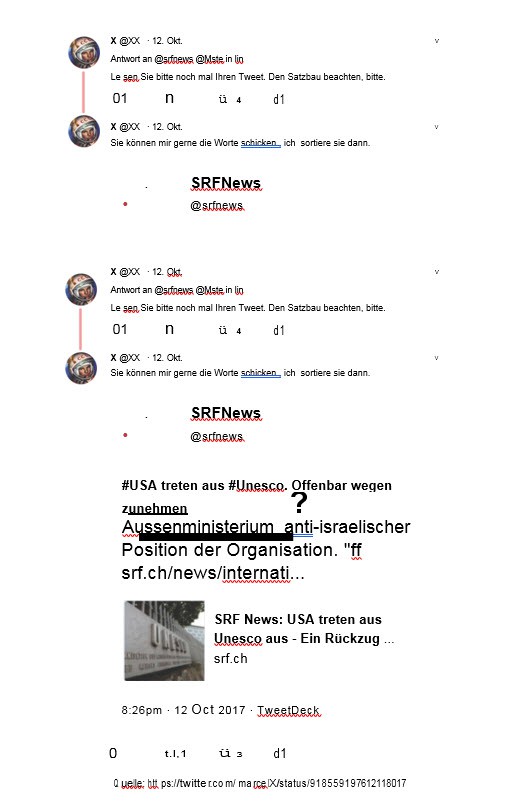 «Besten Dank, geben Sie uns Gelegenheit, auf die Beanstandung von Herrn X einzugehen. Beanstandet wird ein Tweet der Redaktion SRF News.[2] Herr X schreibt: <Gegenstand meiner Beschwerde ist weder Sendung noch der dazugehörende Online-Text>.Es geht in der vorliegenden Beschwerde also lediglich um die Formulierung des Tweets.