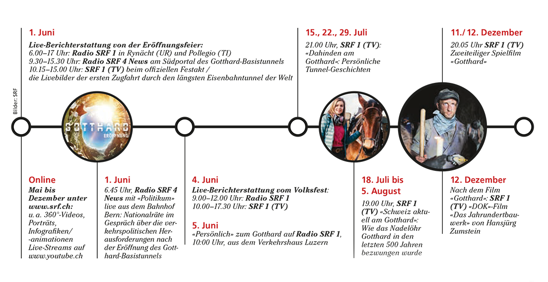 Die Eröffnungsfeier am 1. Juni und das Tunnelfest vom 4. und 5. Juni markieren den Start; im Sommer wird mit der Spezialreihe «Schweiz aktuell am Gotthard» dann die zweite Phase des Gotthardprojekts eingeläutet. Abgeschlossen wird das Gotthardjahr mit der Ausstrahlung des Fernsehfilm-Zweiteilers «Gotthard» – eine Grossproduktion in Kooperation mit ZDF und ORF – pünktlich zum SBB-Fahrplanwechsel vom 11. Dezember und damit zur offiziellen Inbetriebnahme des Gotthard-Basistunnels. Auch diese Programmierung erfolgt auf nationaler Ebene, gemeinsam mit RTS und RSI. Dazwischen wird übers Jahr verteilt ein Programm geboten, das einen «360-Grad-Blick» auf den Gotthard ermöglicht, wie es Läng formuliert.