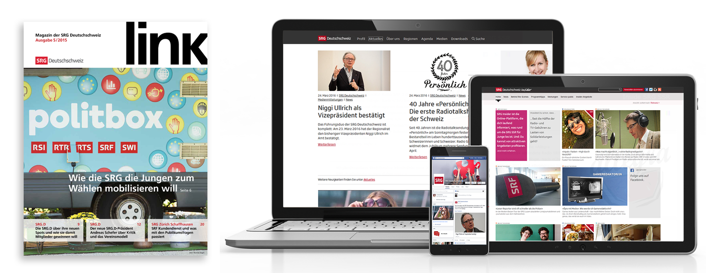 Seit September präsentiert sich die SRG.D mit einem neuen Auftritt im Web, Radio und TV. Die verschiedenen Kommunikationskanäle der SRG.D richten sich vermehrt nach dem veränderten Nutzungsverhalten von Medienkonsumentinnen und –konsumenten aus. So versteht sich die Website www.srgd.ch überwiegend als Newsplattform, die sich täglich mit aktuellen Informationen und Hintergrundgeschichten rund um die SRG und die Schweizer Medienlandschaft an eine interessierte Community richtet. Auch die junge Plattform der SRG.D, SRG Insider , trägt dieser Strategie Rechnung und stellt sich vor allem den Bedürfnissen der jüngeren Generation. Das Mitgliedermagazin LINK vertieft die Themen und ordnet ein. Bei der TV- und Radiokampagne lag der Fokus klar auf dem «gemeinsamen Gestalten». Individuen unterschiedlicher Herkunft und Alters spielen in der Vereinsstruktur der SRG eine zentrale Rolle. In den Spots widerspiegeln diverse Charaktere die Vielfältigkeit der Trägerschaft und laden zum aktiven Mitwirken als Mitglied ein.