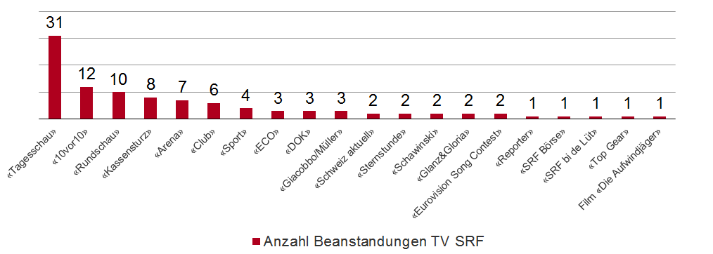 Von den 138 nach RTVG materiell behandelten Beanstandungen betrafen 36 (Vorjahr 23) Radio SRF, 102 (Vorjahr 374) TV SRF, eine betraf beide Medien. Es fällt erneut auf, dass vor allem die Informationssendungen «Tagesschau» (31 Beanstandungen) und «10 vor 10» (12) beanstandet wurden. Dies überrascht nicht, geht es doch meistens um das Sachgerechtigkeitsgebot, welches insbesondere bei Informationssendungen verlangt wird. Es folgen «Rundschau» (10), «Kassensturz» (8), «Arena» (7) und «Club» (6).