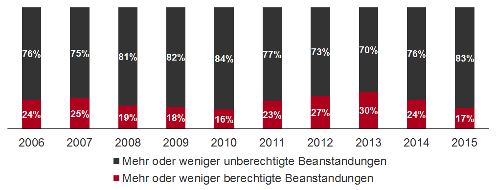 2015 hat die Ombudsstelle 17 % der Beanstandungen als «mehr oder weniger berechtigt» beurteilt und 83 % als «mehr oder weniger unberechtigt». Im Vergleich zu den letzten Jahren hat die Anzahl der als «mehr oder weniger berechtigt» beurteilten Fälle im Berichtsjahr weiter abgenommen. Dabei gilt es zu berücksichtigen, dass nicht weniger als sieben berechtigte Beanstandungen die gleiche Sendung betrafen (es ging um die Sendung «Kassensturz» über die Haltung der Parteien bezüglich Konsumentenschutz).