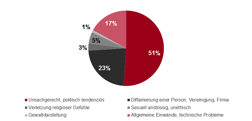 Die meisten Beanstanderinnen und Beanstander (51 %) kritisierten, eine Sendung sei nicht sachgerecht gewesen oder würde eine Person, Vereinigung oder Firma diffamieren (23.5 %). Im Vergleich zum Vorjahr sind diese Werte gestiegen. Leicht zugenommen haben die Beanstandungen über die Verletzung religiöser Gefühle (3 %). Im Vergleich zum Vorjahr wurden sexuelle Anstössigkeit (mit 5 %) und die Darstellung von Gewalt (1 %) weniger häufig moniert. Die restlichen 17 % der Beanstandungen verteilten sich auf allgemeine Einwände und technische Fragen (Vorjahr 29 %).