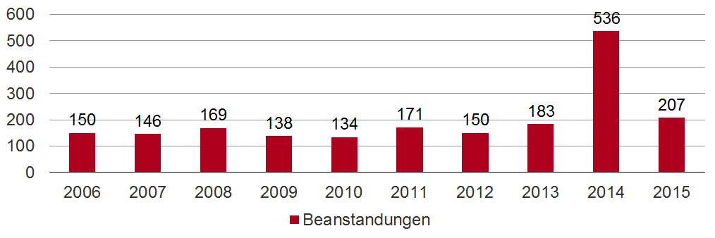 Bis Ende Jahr wurden lediglich 16 Beanstandungen (Vorjahr 14) an die Unabhängige Beschwerdeinstanz UBI weitergeleitet. Dies entspricht dem Durchschnitt der letzten Jahre und bestätigt, dass sich das vom Gesetz gewollte zweistufige Verfahren zur Entlastung der UBI auch im Jahr 2015 bewährt hat.