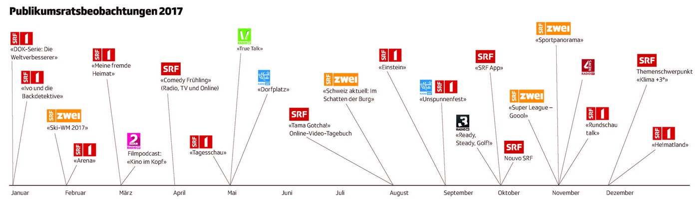 Im Berichtsjahr standen insgesamt 25 Beobachtungen auf dem Programm des Publikumsrats. Über die Ergebnisse diskutierten die Ratsmitglieder an zehn Plenarsitzungen intensiv und konstruktiv-kritisch mit den Programmverantwortlichen von SRF. Die Beurteilungen erfolgten zum einen aufgrund von generellen Qualitätskriterien, wie sie in der Konzession oder in den publizistischen Leitlinien vorgegeben sind. Zum anderen kamen subjektive Beurteilungen der Angebotsattraktivität sowie publikumsethische Aspekte hinzu.